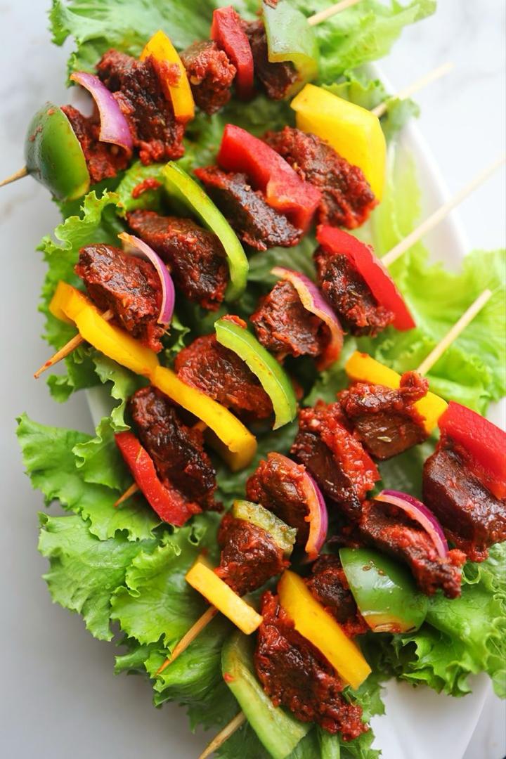 Suya is a popular Nigerian street food made with spicy grilled skewered meat, typically beef, served with sliced onions and tomatoes. It pairs well with fresh bread or roasted plantains. (Comes on its own.)